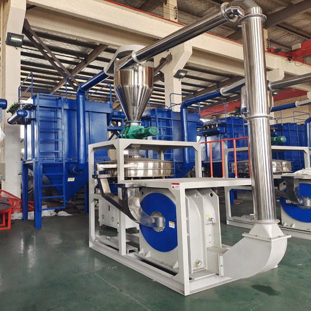 SPC/WPC 地板粉碎料通過料斗進入磨粉機主機,在主機內(nèi)部動刀與定刀的作用下粉碎研磨成細(xì)粉,粉料通過風(fēng)機的帶動進入振動篩進行篩選,未達(dá)標(biāo)的物料重新進入研磨室進行粉碎,達(dá)到要求的粉末通過出料口進行統(tǒng)一收集。